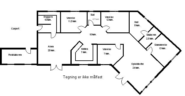 Husets planløsning rummer tre værelser, et badeværelse og et bryggers i forbindelse med entré. Indretningen lader solens lys strejfe gennem huset hele dagen.